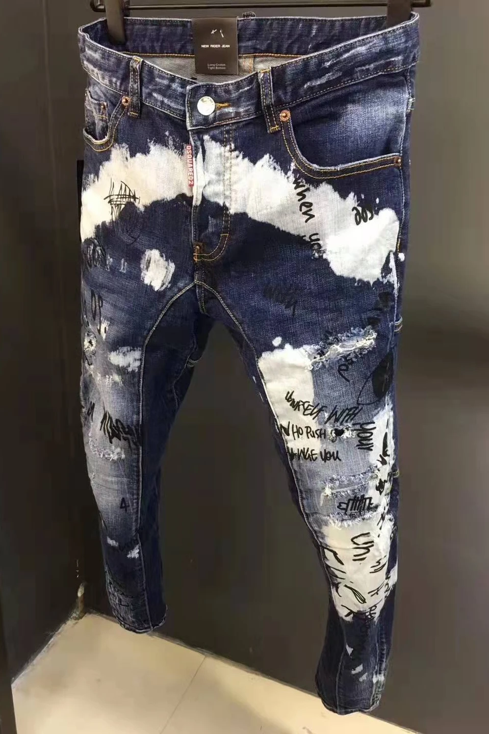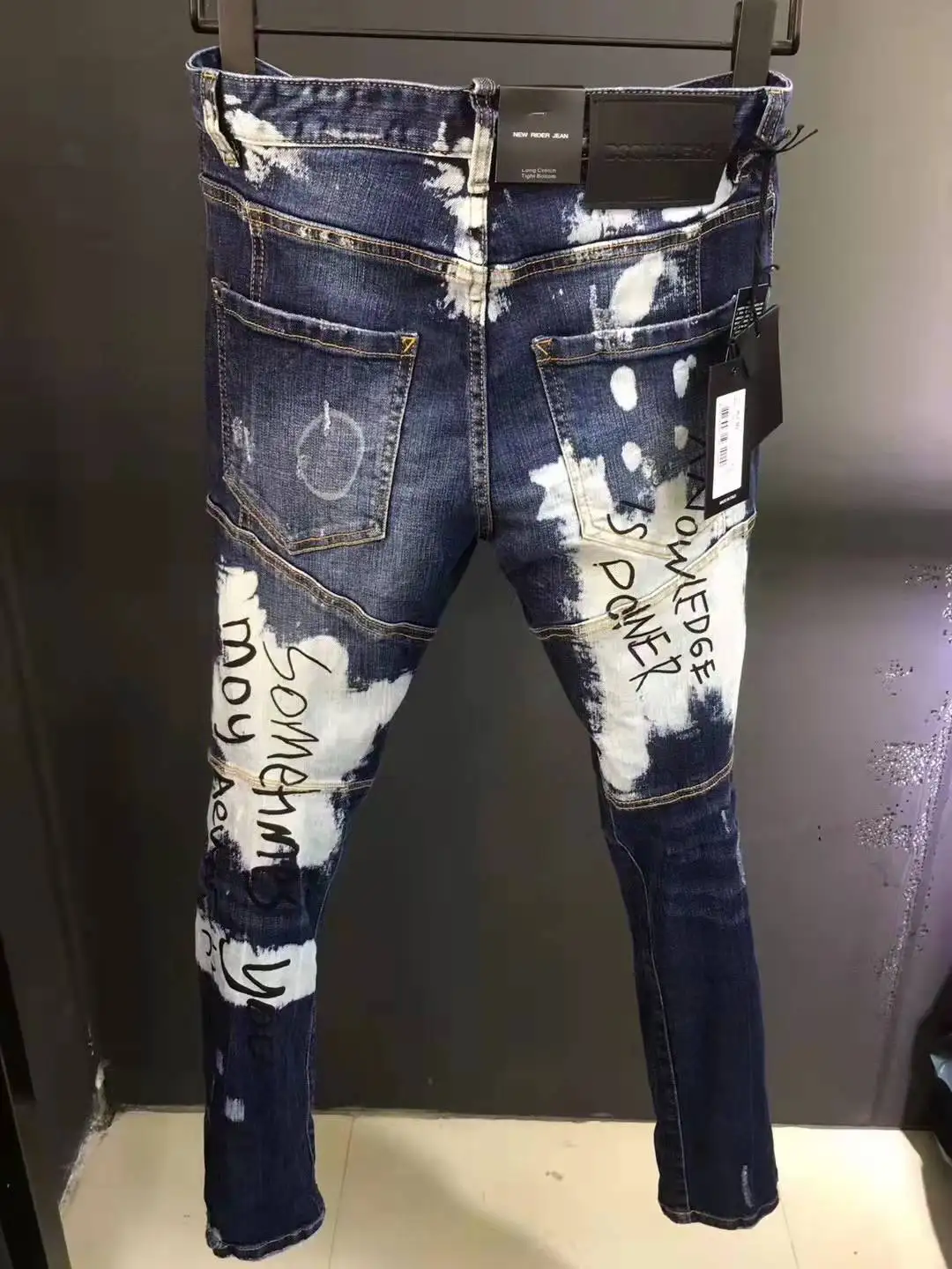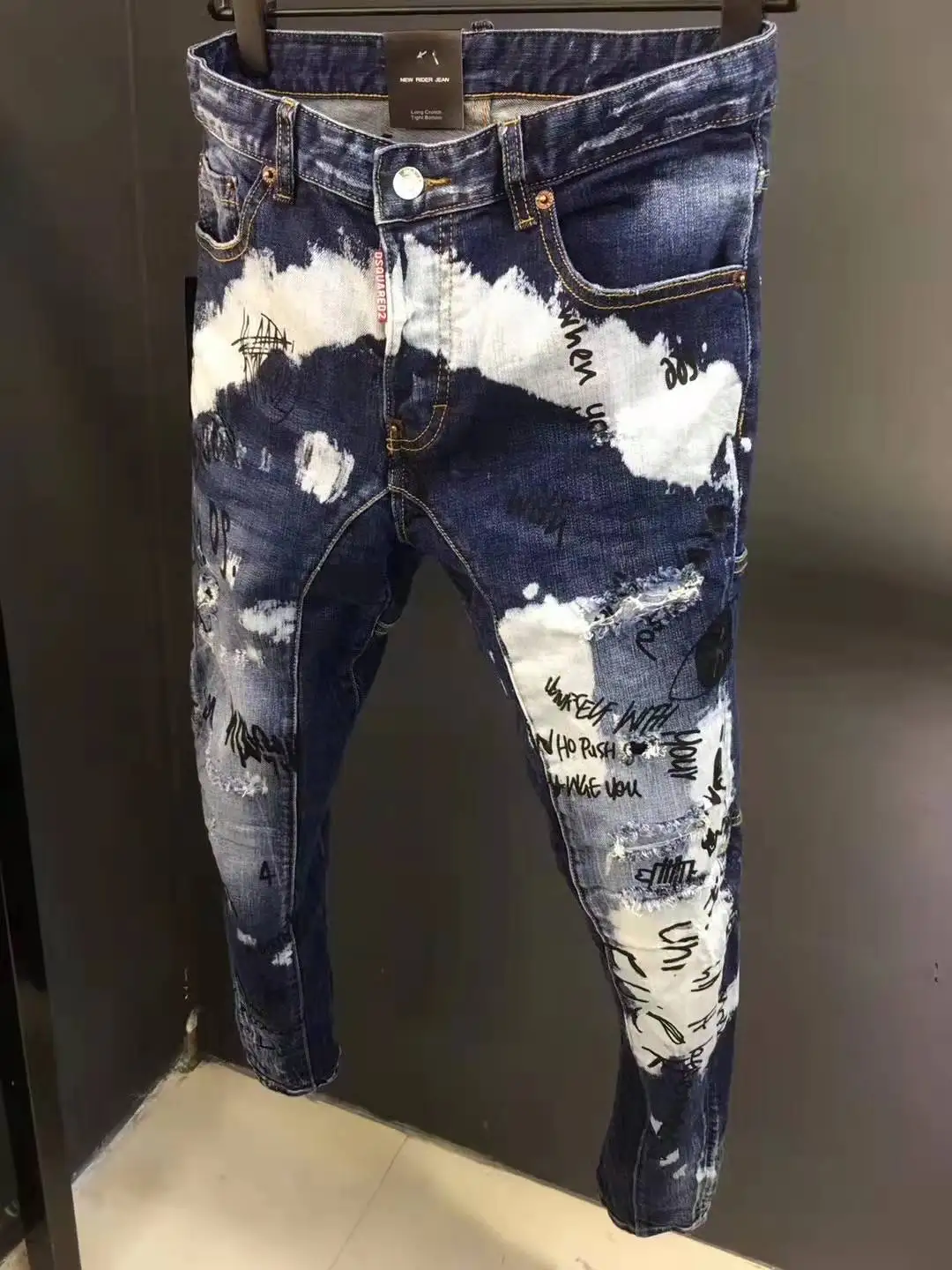 Spring Summer D2 Trendy Men's Distred Patch 3D Cutting fiti Print Slim Elastic Ankle Jeans Casual Busin Casual
