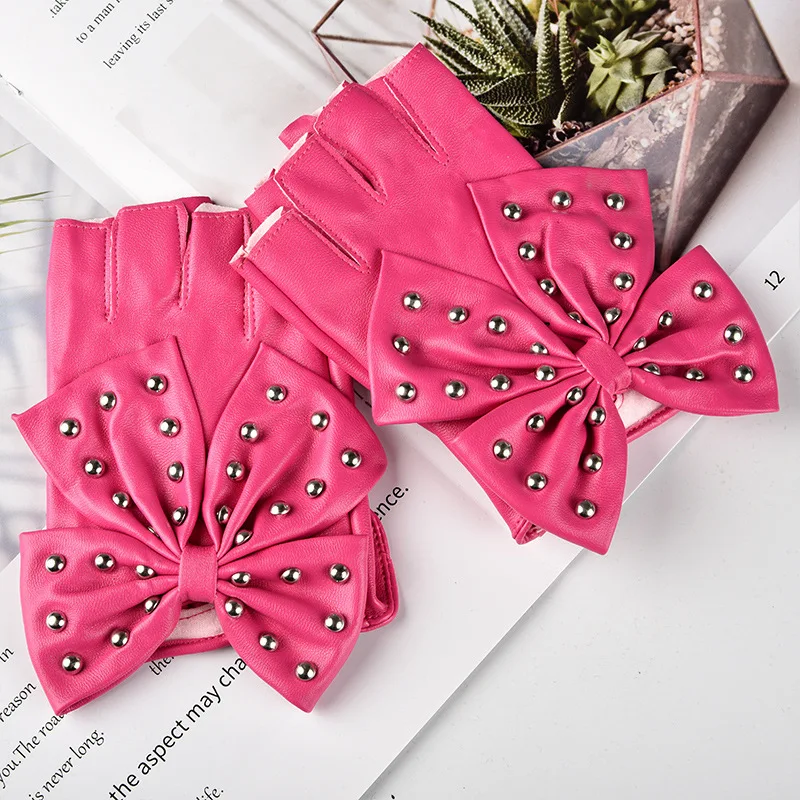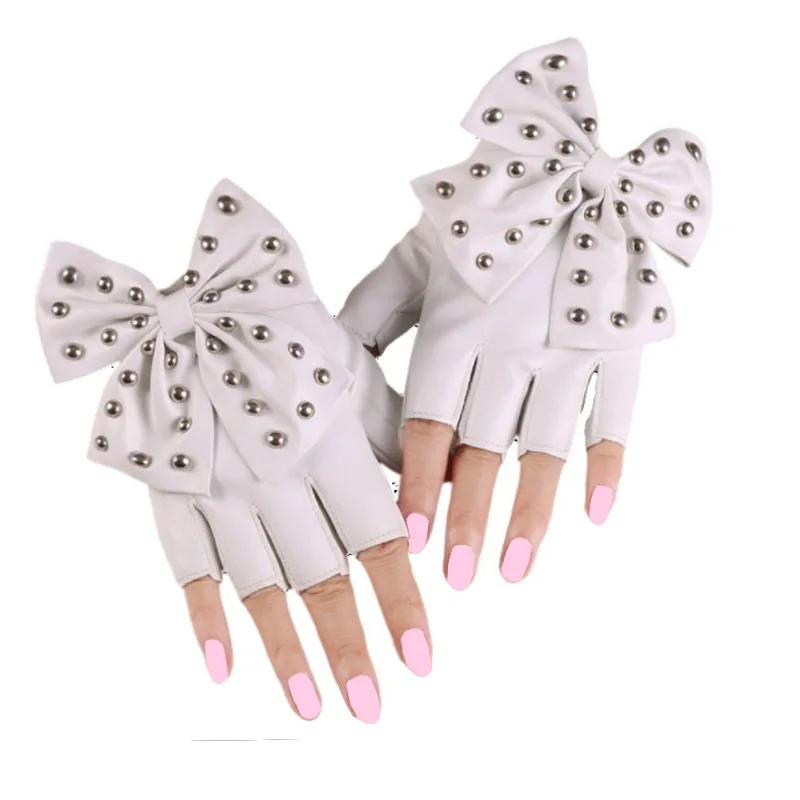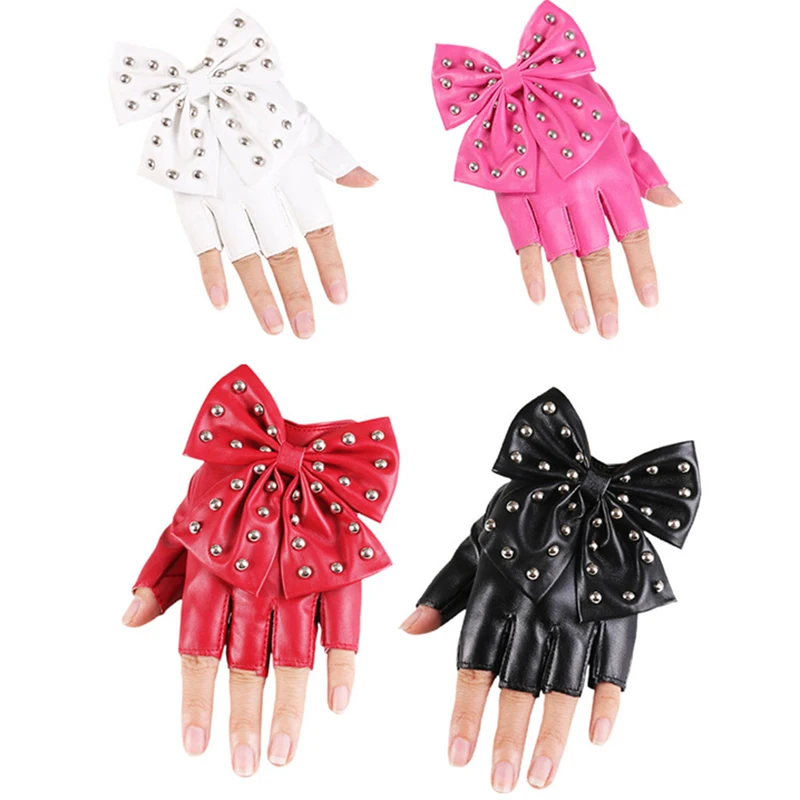 Fashion PU Leather Gloves Big Bow Rivet Sexy Disco Dancing Rock And Roll, Black Punk