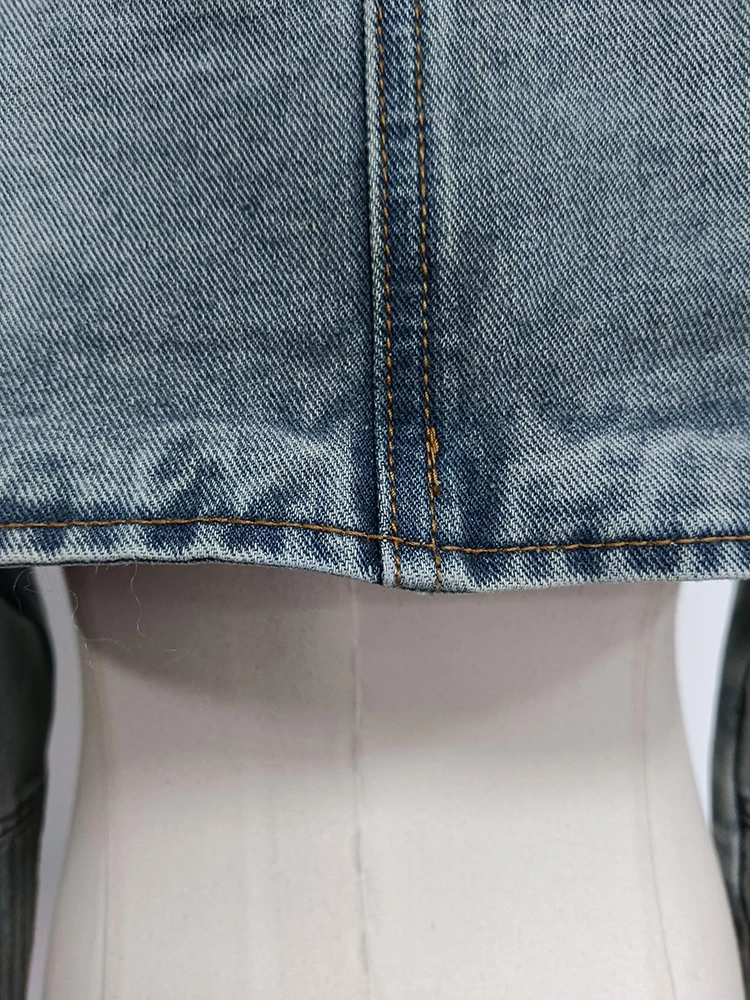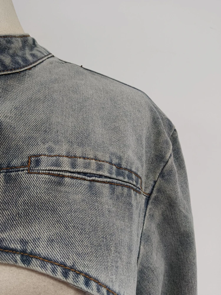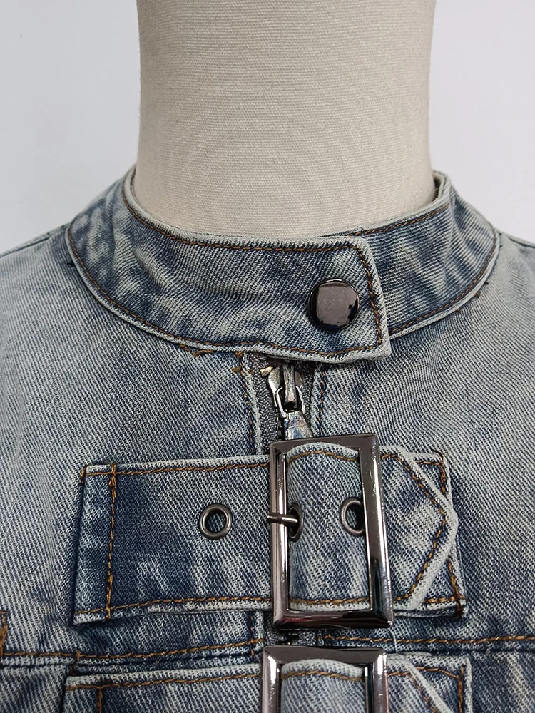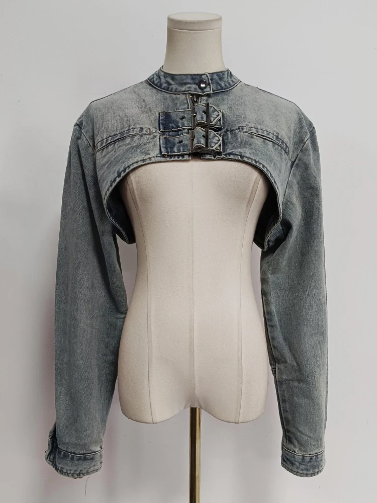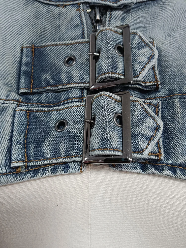 Sexy Hollow Out Denim Two Piece Set Long Sleeve Splicing Buckle Set for Women