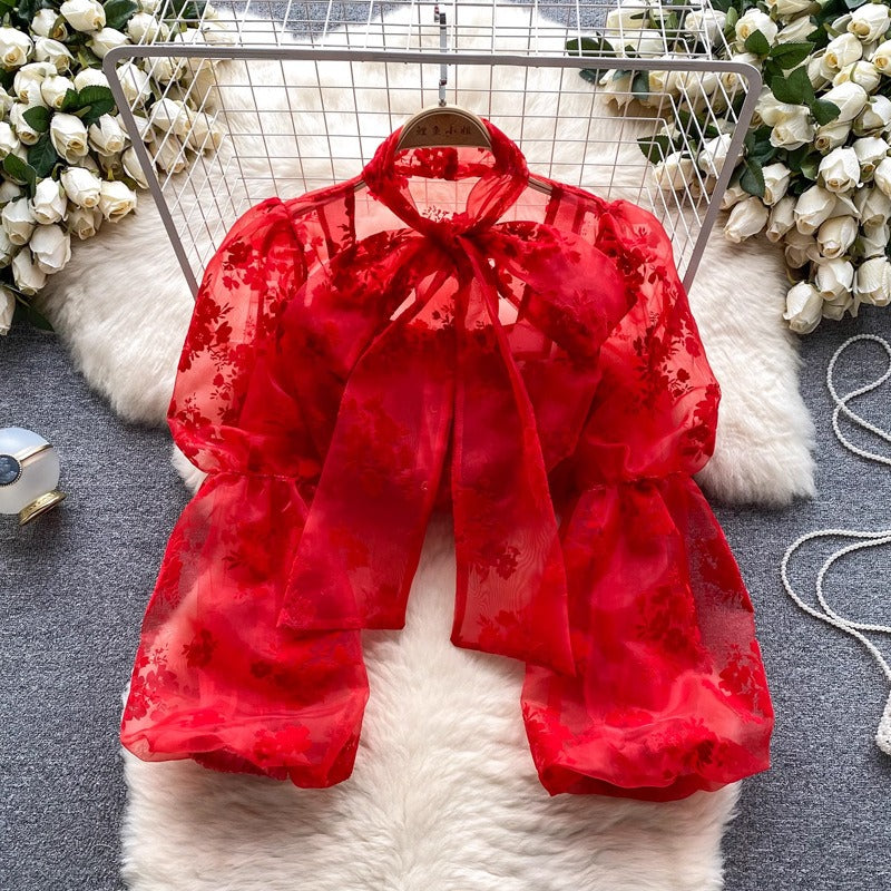 Women's niche western-style tops, French court style, bow tie puff sleeves