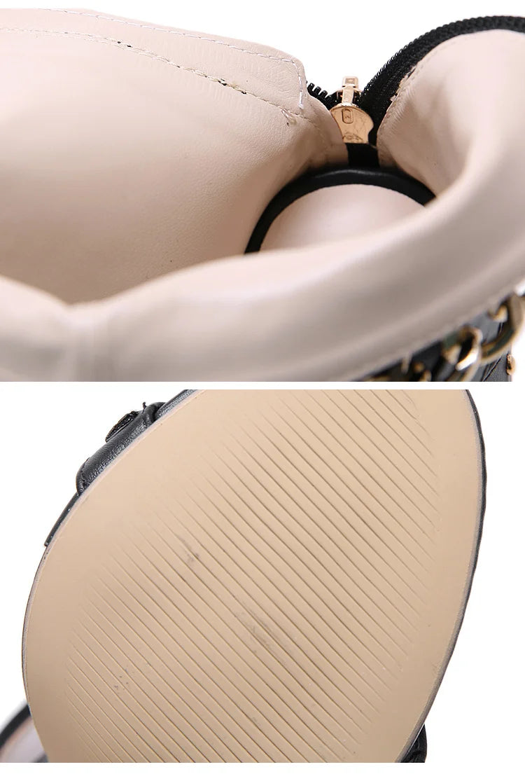 Aneikeh Sexy Rivet Metal Chain Sandals Peep Toe Thin Heel Pumps Gladiator Sandalias Zipper Women High Shoes