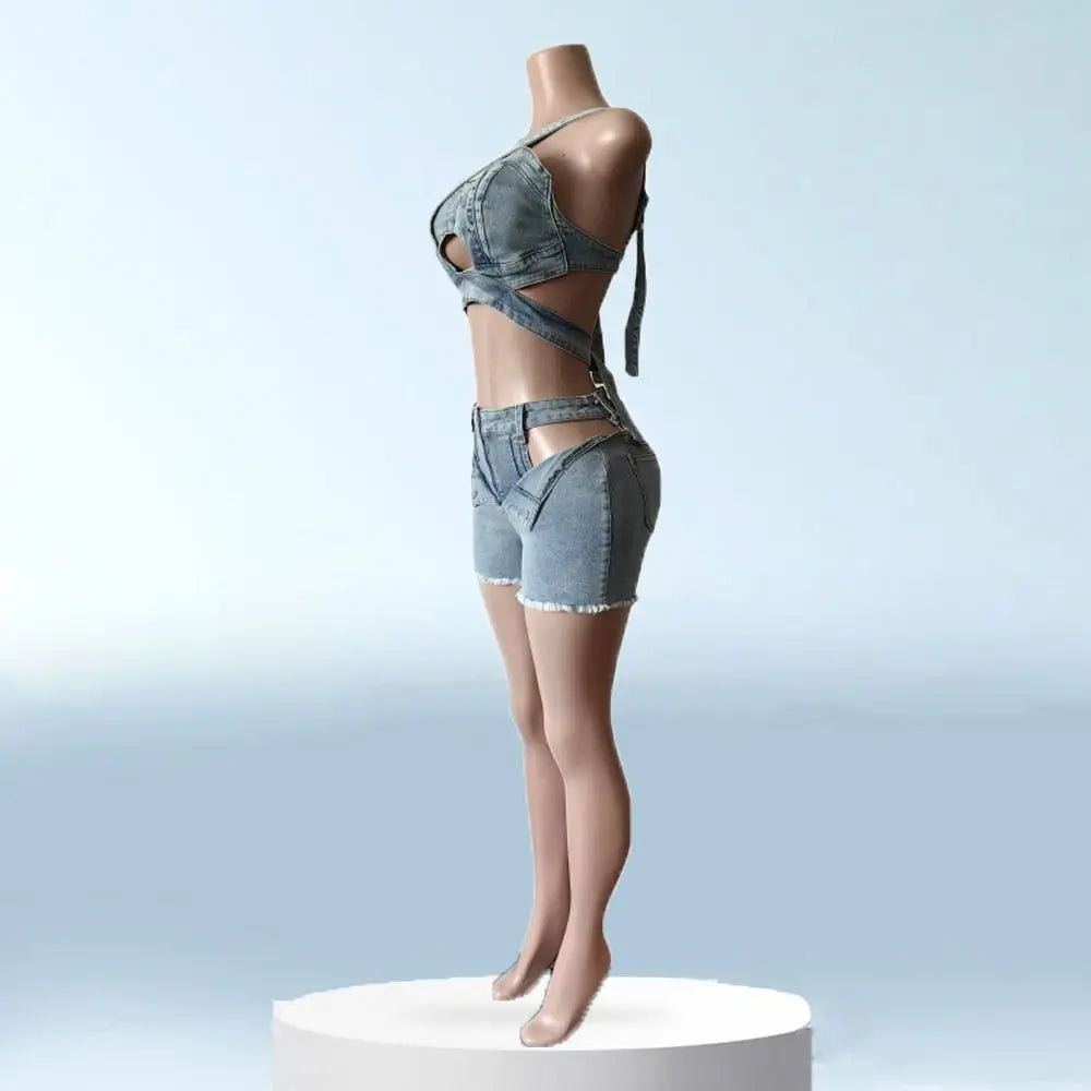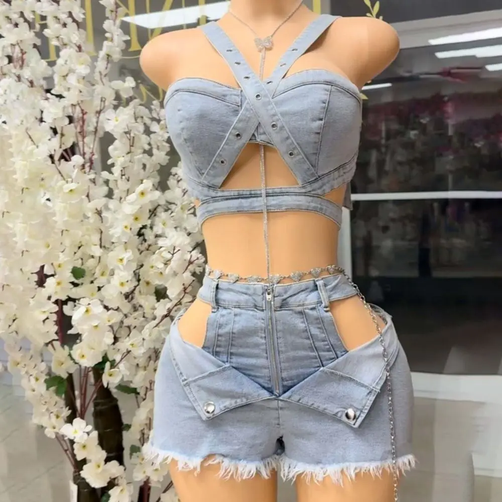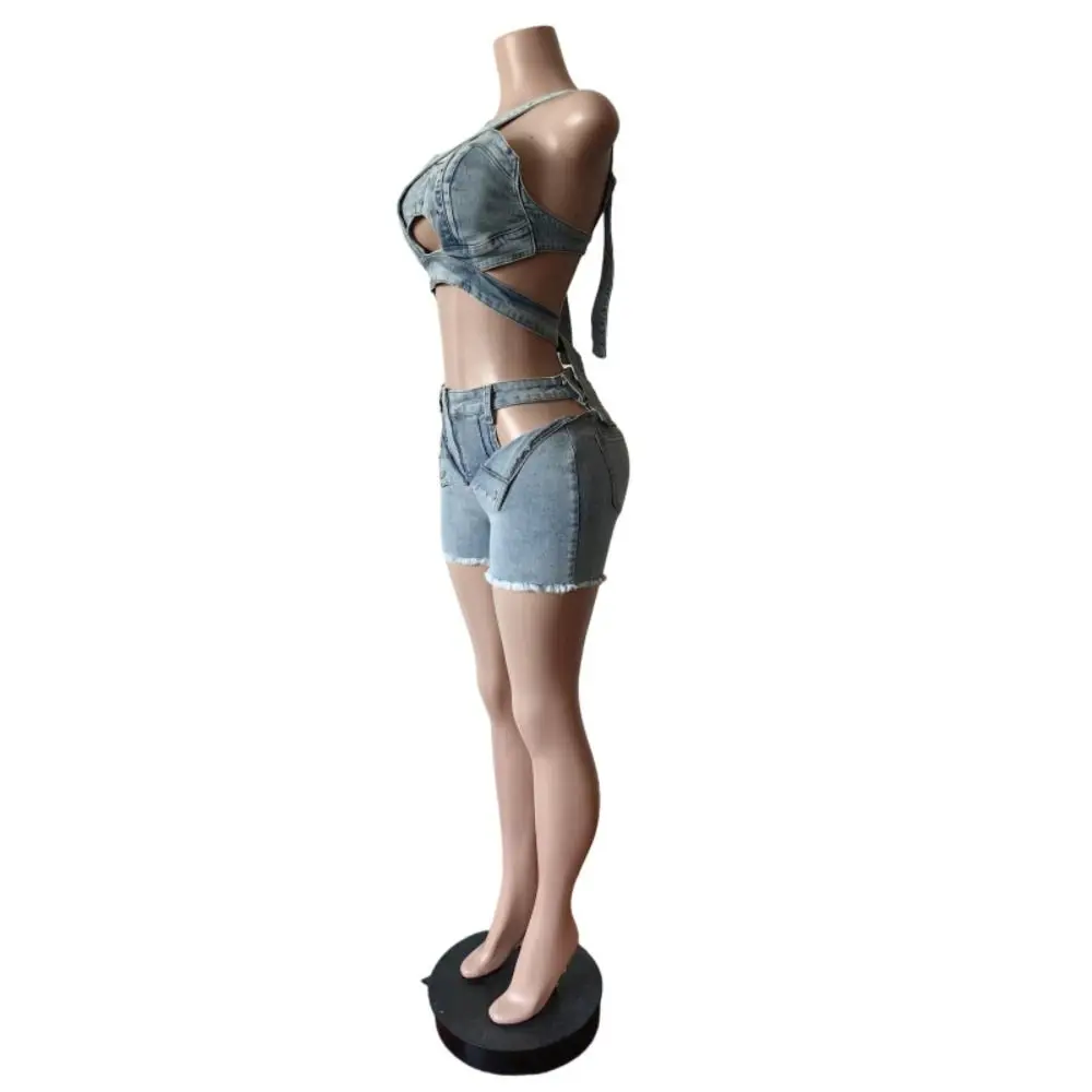 Harajuku Retro Cowboy Shorts Sets Jumpsuits Cross Belt Denim Crop Top Shorts Hollow Spicy Girl Style Sleeveless Bodysuit Beach