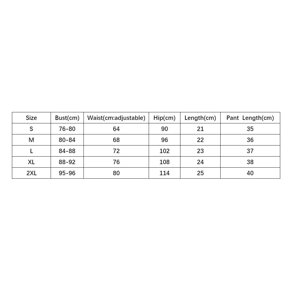 Size XL:Bust:88-92cm(34.65-36.22in),Waist(adjustable):76cm(29.92in),Hip:108cm(42.52in),Length:24cm(9.45in),Pant Length:38cm(14.96in)