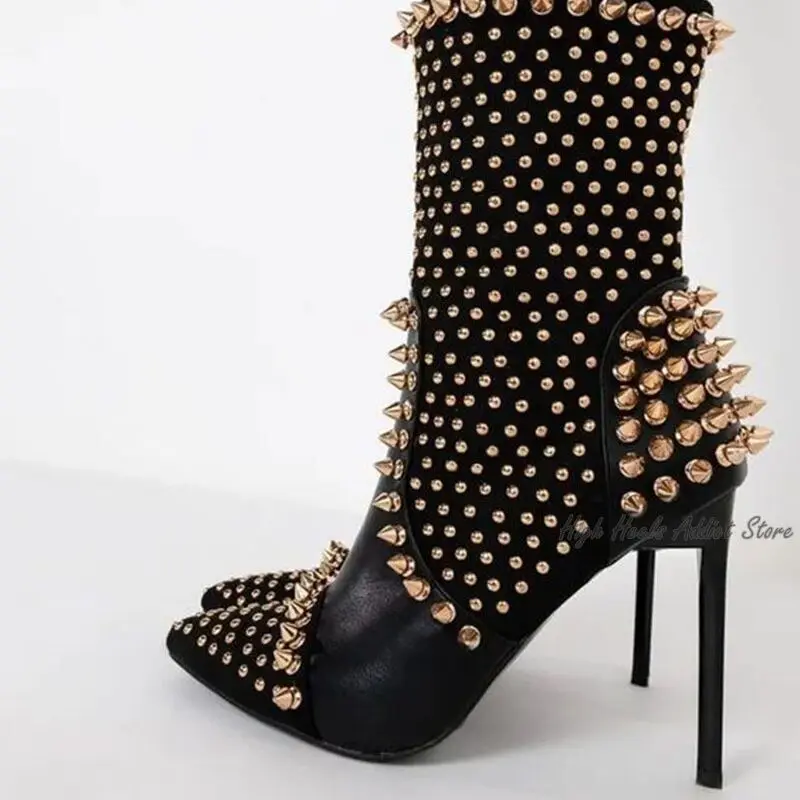 Black Studded Luxury Ankle Boots Women Sexy Full Stud High Heels Leather Sexy Booties Designer Dress Shoes