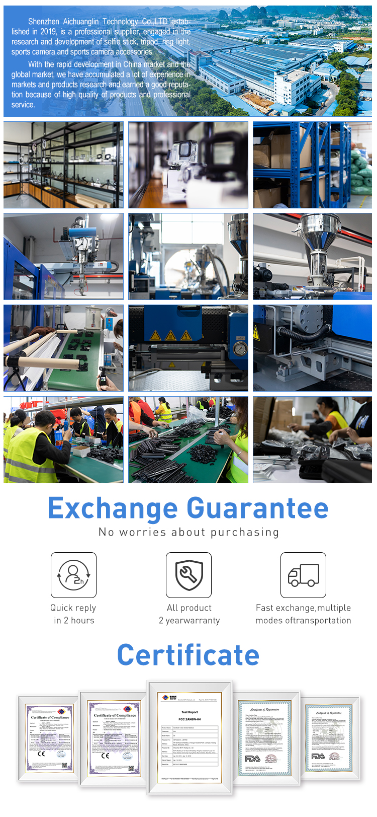 Q1: Are you a manufacturer or trading company?A: We are professional manufacturer of selfie stick ,tripod and sport camera accessories, in Shenzhen. Q2: How do you control the quality ?A:Aichuanglin have reliable and strict quality control system,100% aging testing before packaging.Third party inspection are also acceptable. Q3. Can you customized logo and packaging?A: Yes, OEM/ODM/RTS are acceptable. MOQ=1PCS. Our design team will help you design as your requirement.Q4: When will the goods ship ? A:We have enough stock to ship out within 48hours, We usually ship by Ali-Logistics, DHL, UPS, Fedex, TNT, EMS, SF Express or your designated forwarder.Q5: How to place an order ?A:“Start Order” “Choose the quantity, colors” “Filling your address"(remember to put your Phone Number & Post Code)” Or you could "Send inquiry" to us , we will fast reply within 2 hours of work time.