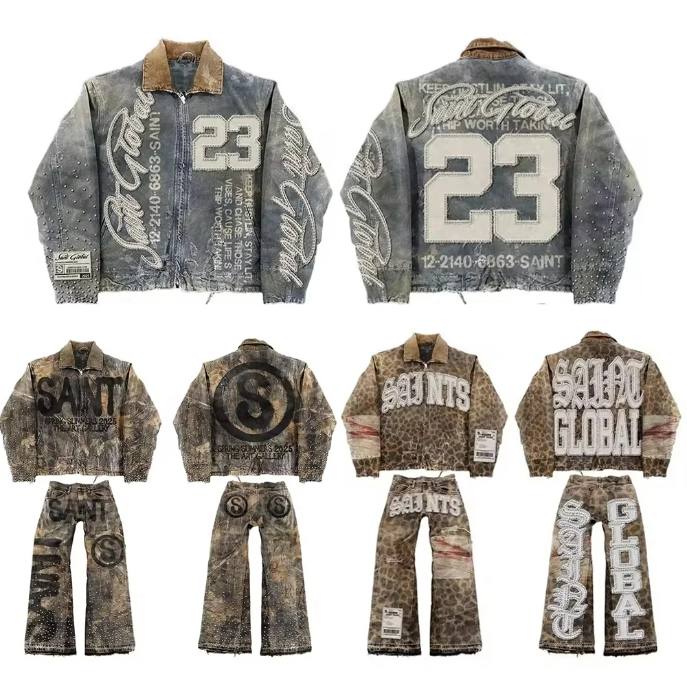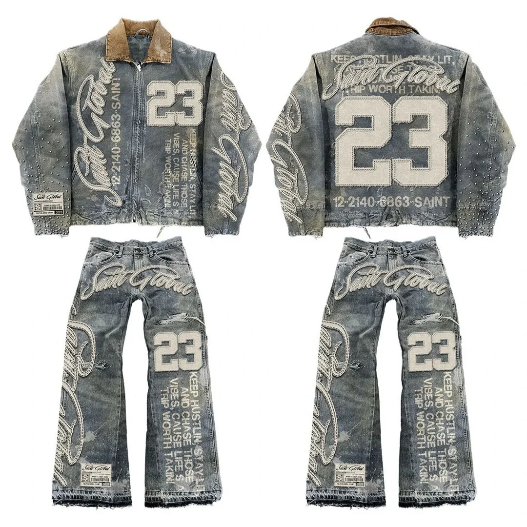 American Retro Denim Jacket Jeans Two Piece Y2K Clothing Mens Womens Hip Hop Monogram Patchwork Oversized Coats Pants Suit