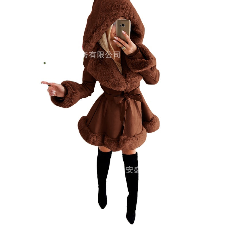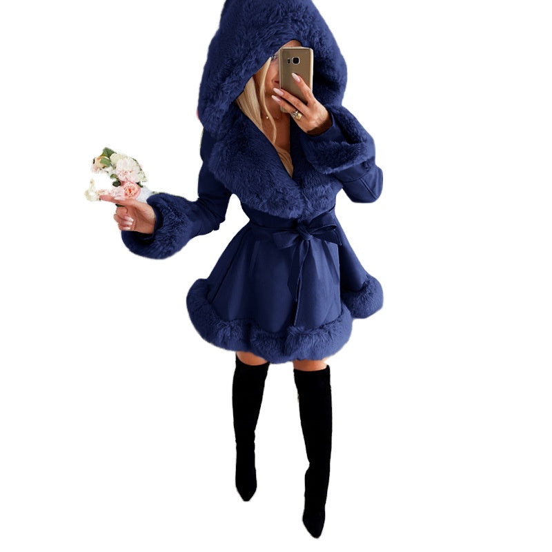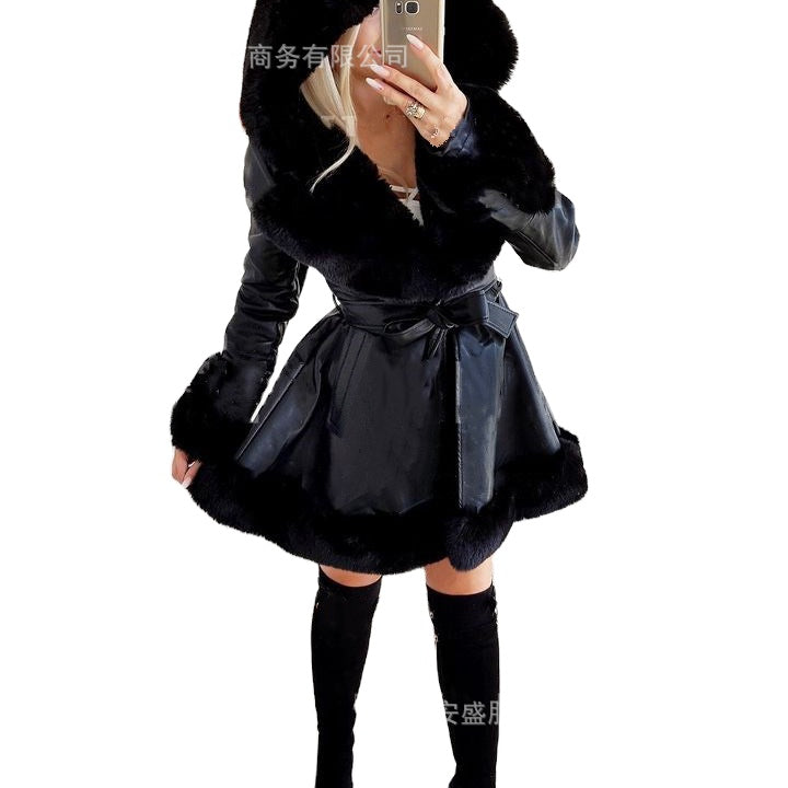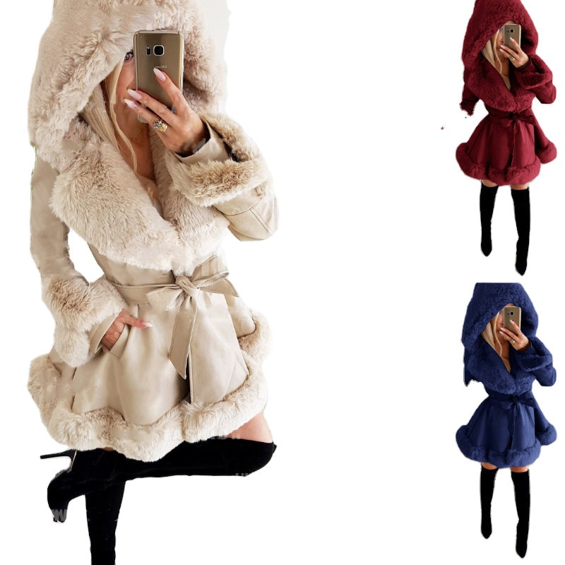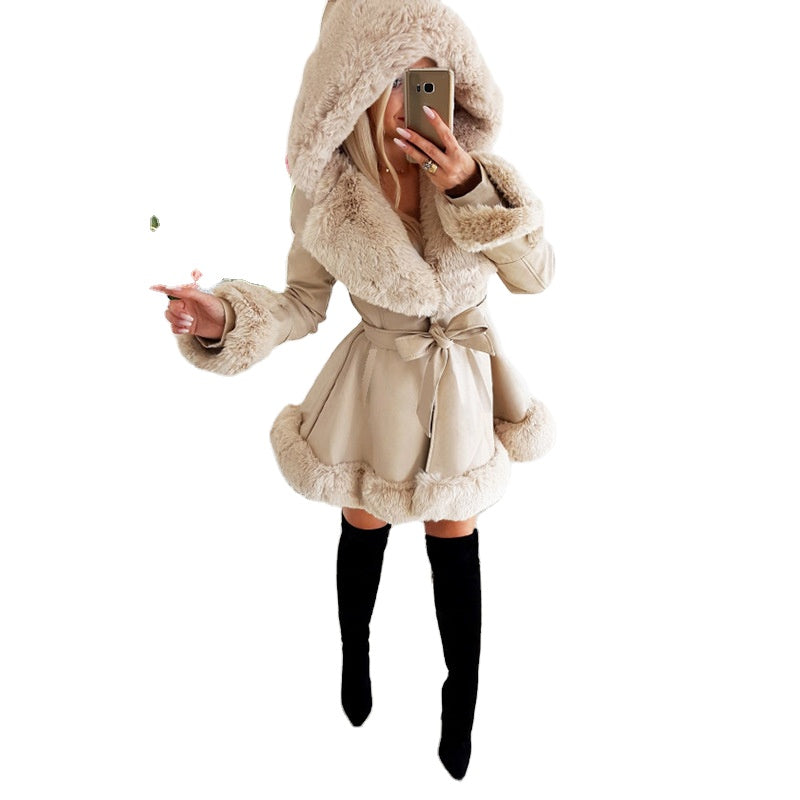 Fashion Coat With Belt Leather Plush Fur Lining Trim Thick Parka Women Winter Faux Warm Plus Size Hooded Coat