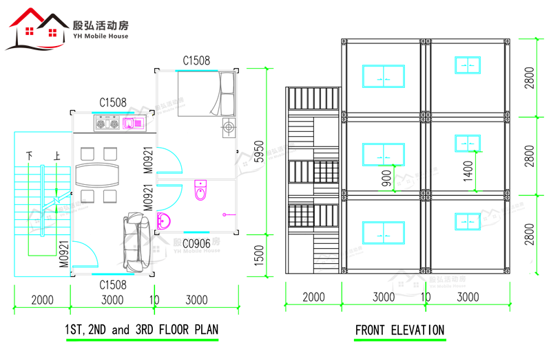 5950*3000*2850(L*W*H) use 6units container house to combinations |