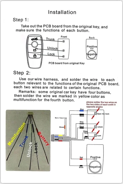 5. Solder the wiring harness - unlock, lock, trunk and multi-function correspondingly on the original key circuit board, please note the solder on the foot of the button, and there is no need to separate the positive and negative.