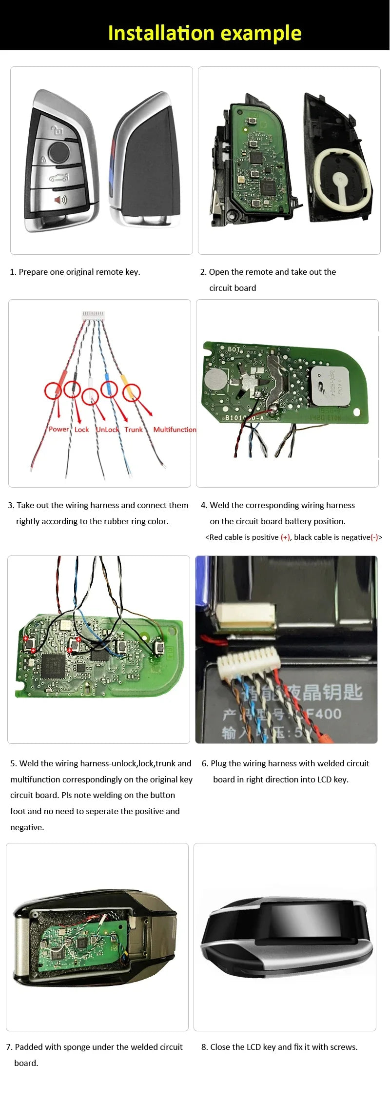 2. You need to disassemble the original car key, remove the circuit board of the original car key, and solder the circuit board onto the wiring harness of the LCD key. There must be no errors in the welding and it must be done correctly, so that the LCD key can carry out the functions of the circuit board of the original car key.
