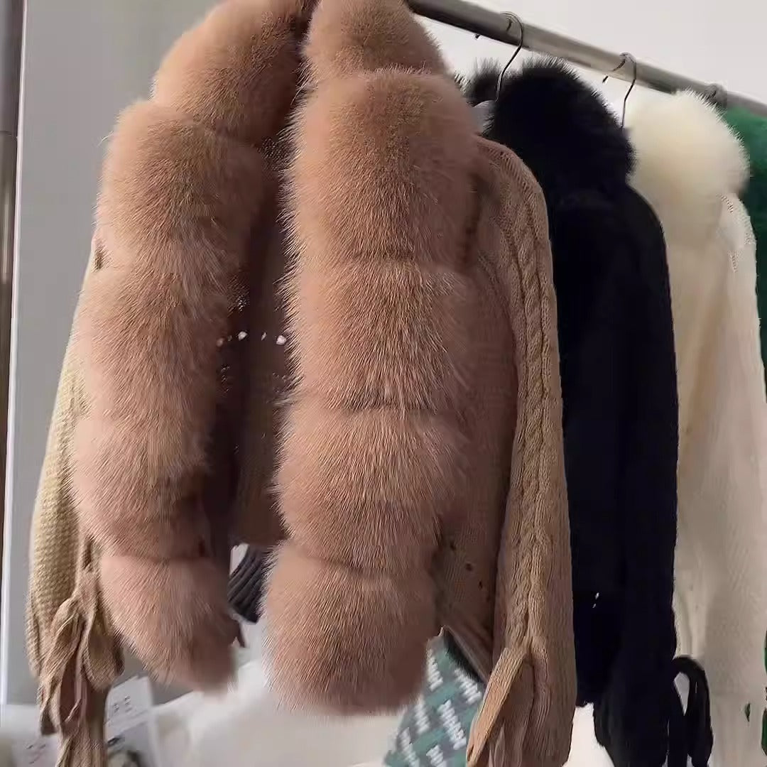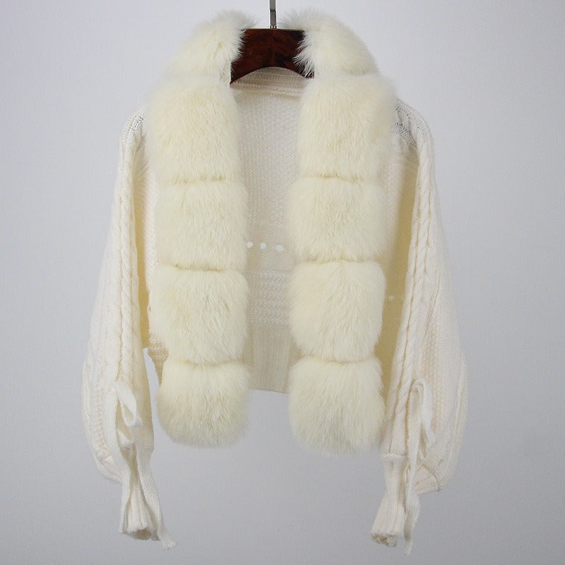 New Fashion Short Warm Loose Knitted Jacket with Natural Fur Placket Coat