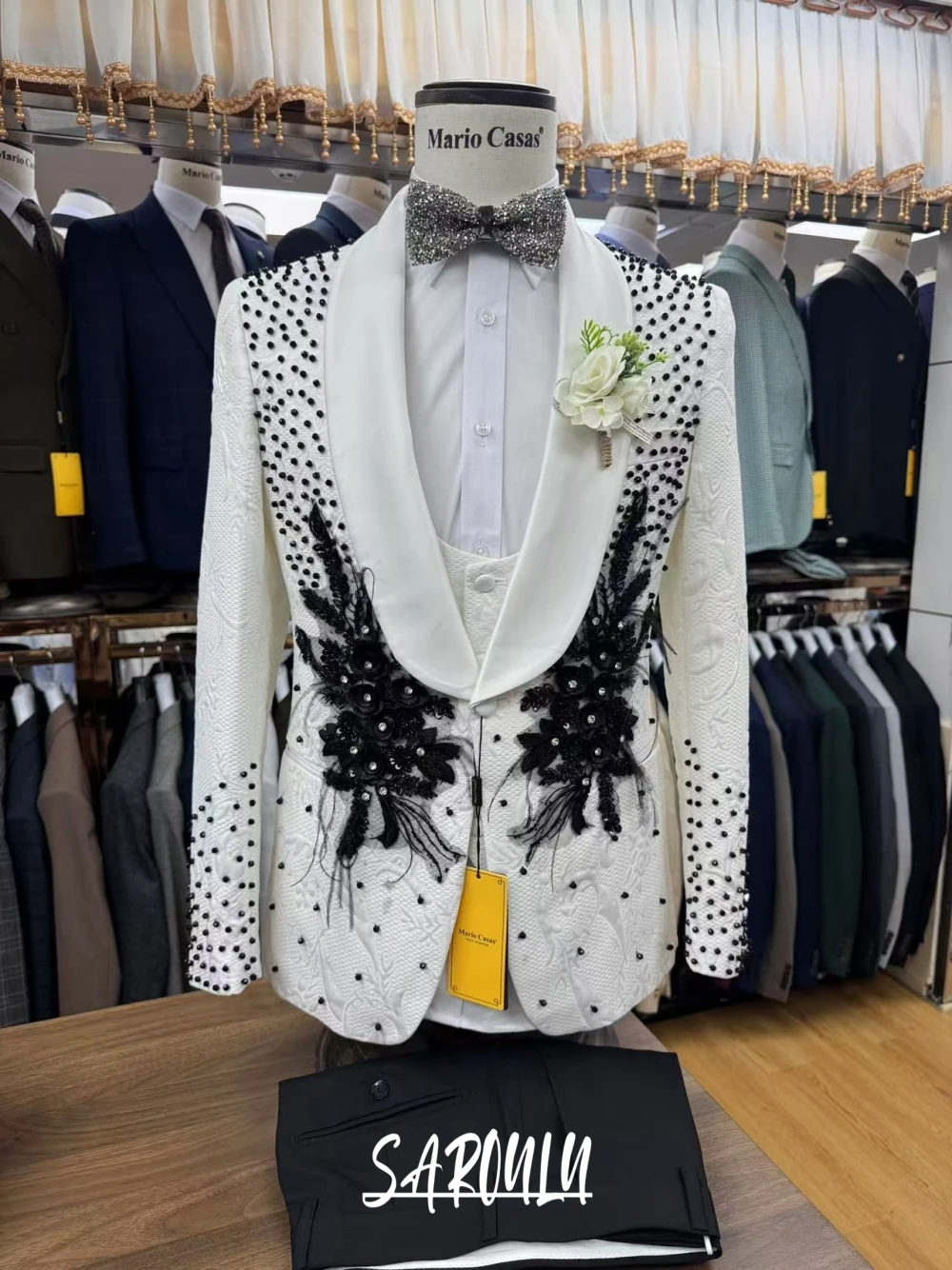 On Sale Luxurious Shawl Lapel Men's Suit Customized Jacquard Popular Beading Crystals Jacket Pants Vest Groom Wear Four Seasons