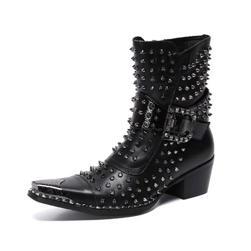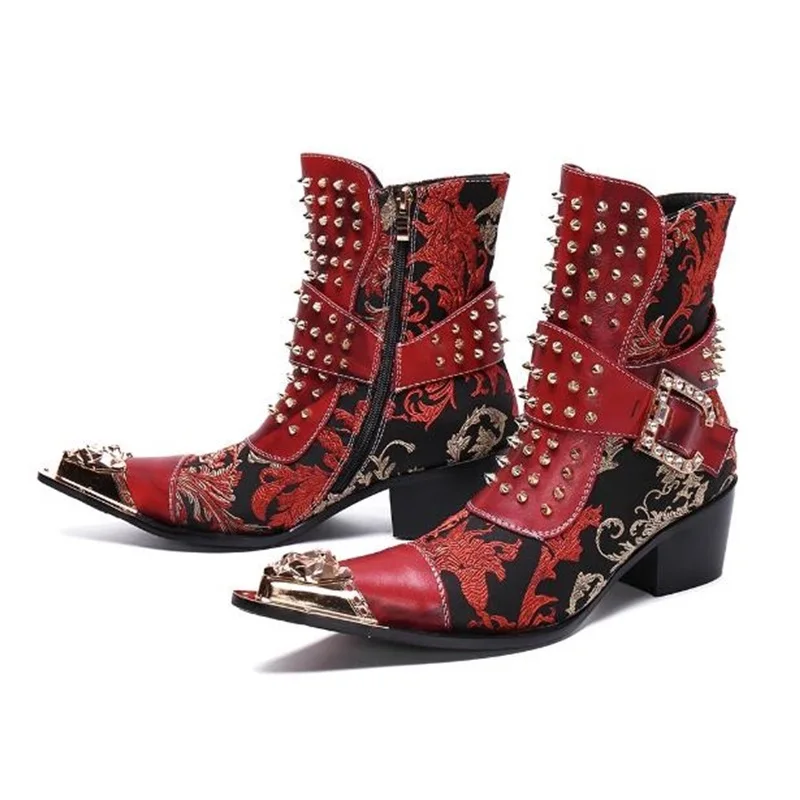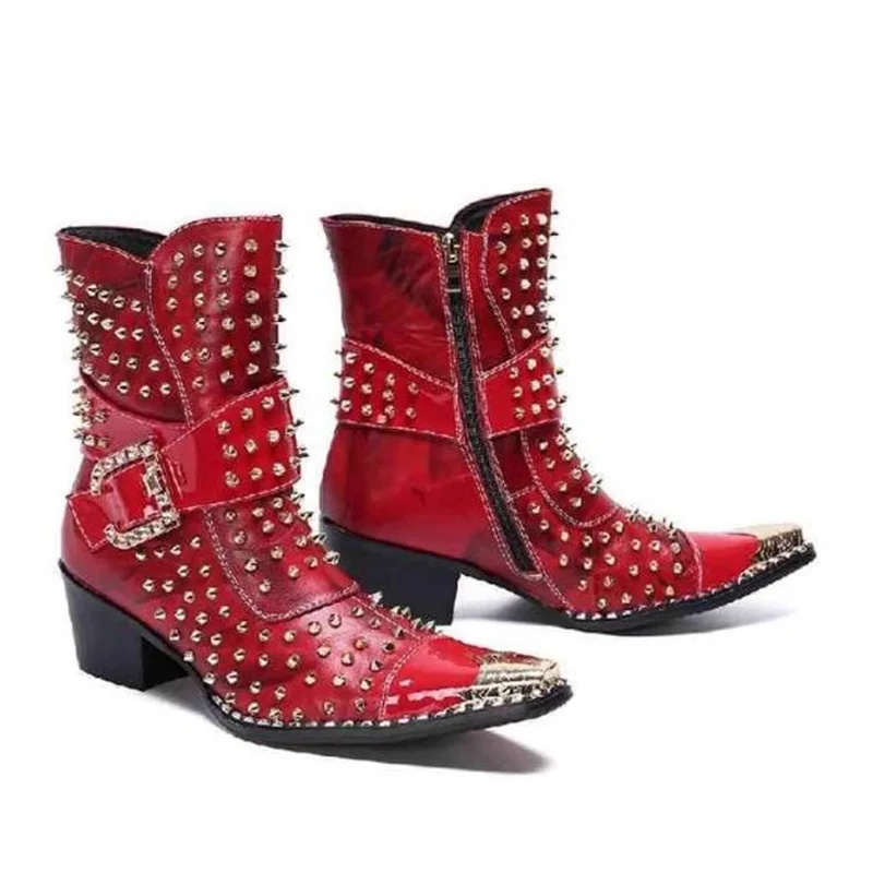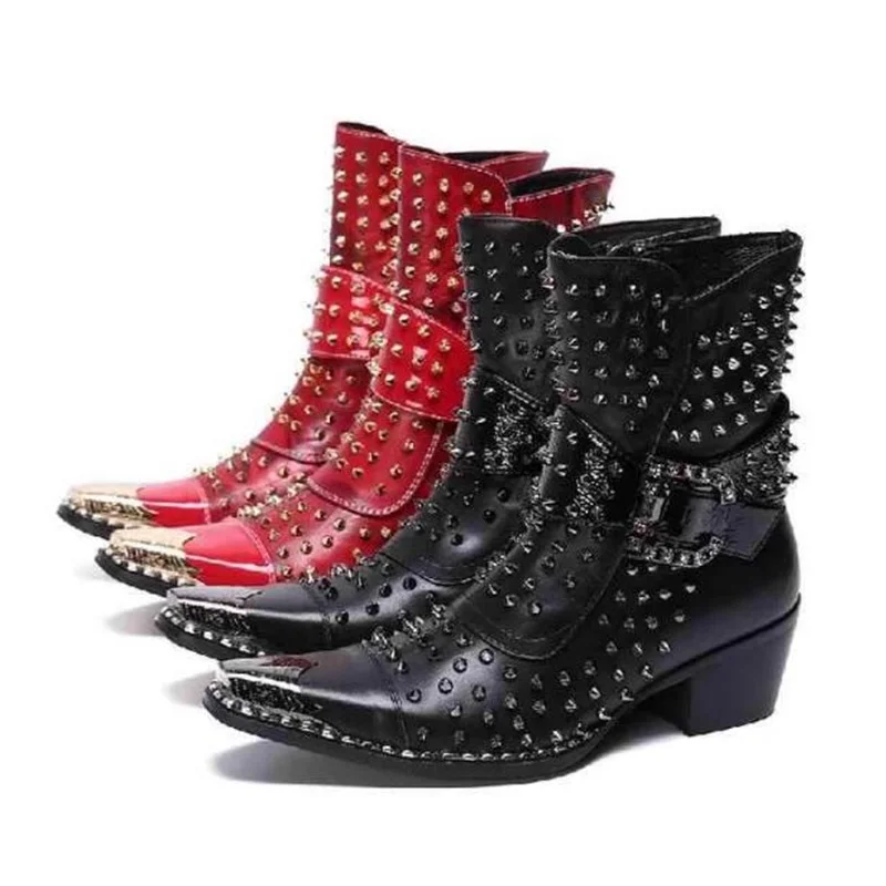 Red Black Leather Pathcwork Studded Ankle Boots For Men Gold Iron Toe Buckle Strap Block Heels Runway Cowboy Riding Chelsea Boot