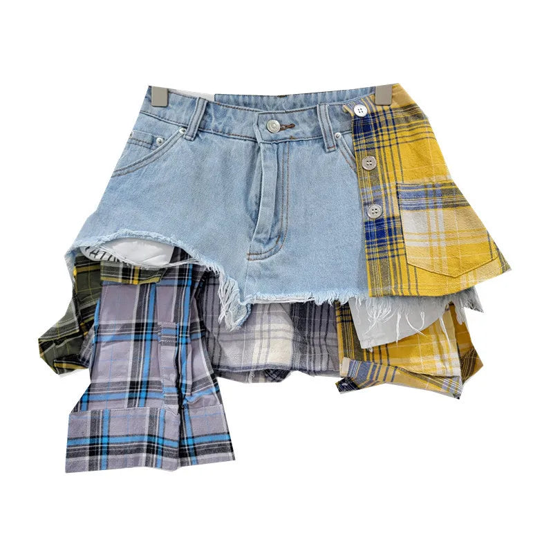 YEAE plaid patchwork irregular denim shorts women's fashion high-waisted A-word denim shorts skirt