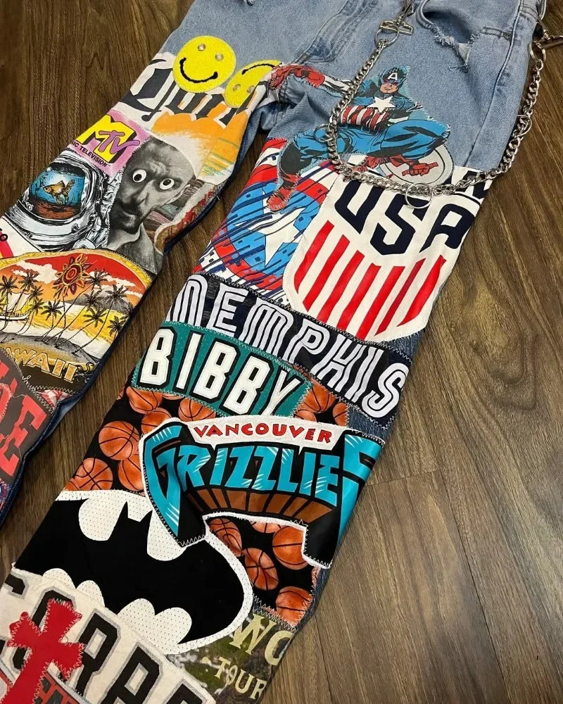 Hip-hop style high-waisted washed cartoon jeans oversized wide-legged pants men rock & women
