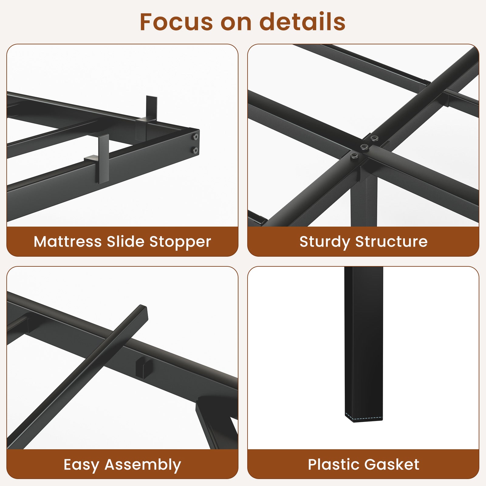 Each metal platform bed frame is equipped with 4 mattress sliding blocks. Just press it onto the installed metal bed frame. The mattress sliding block is made of high-quality materials, durable and does not require screws. It can be customized to fit perfectly and prevent any unwanted movement or sliding of the mattress.