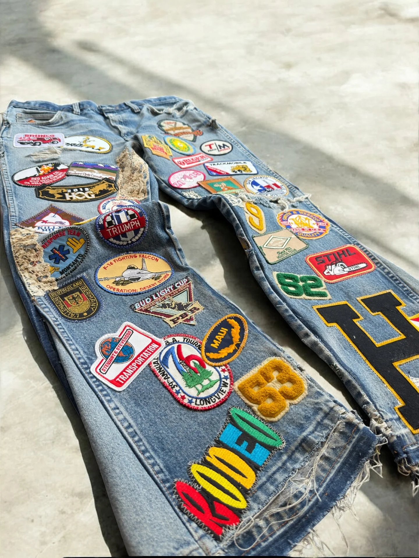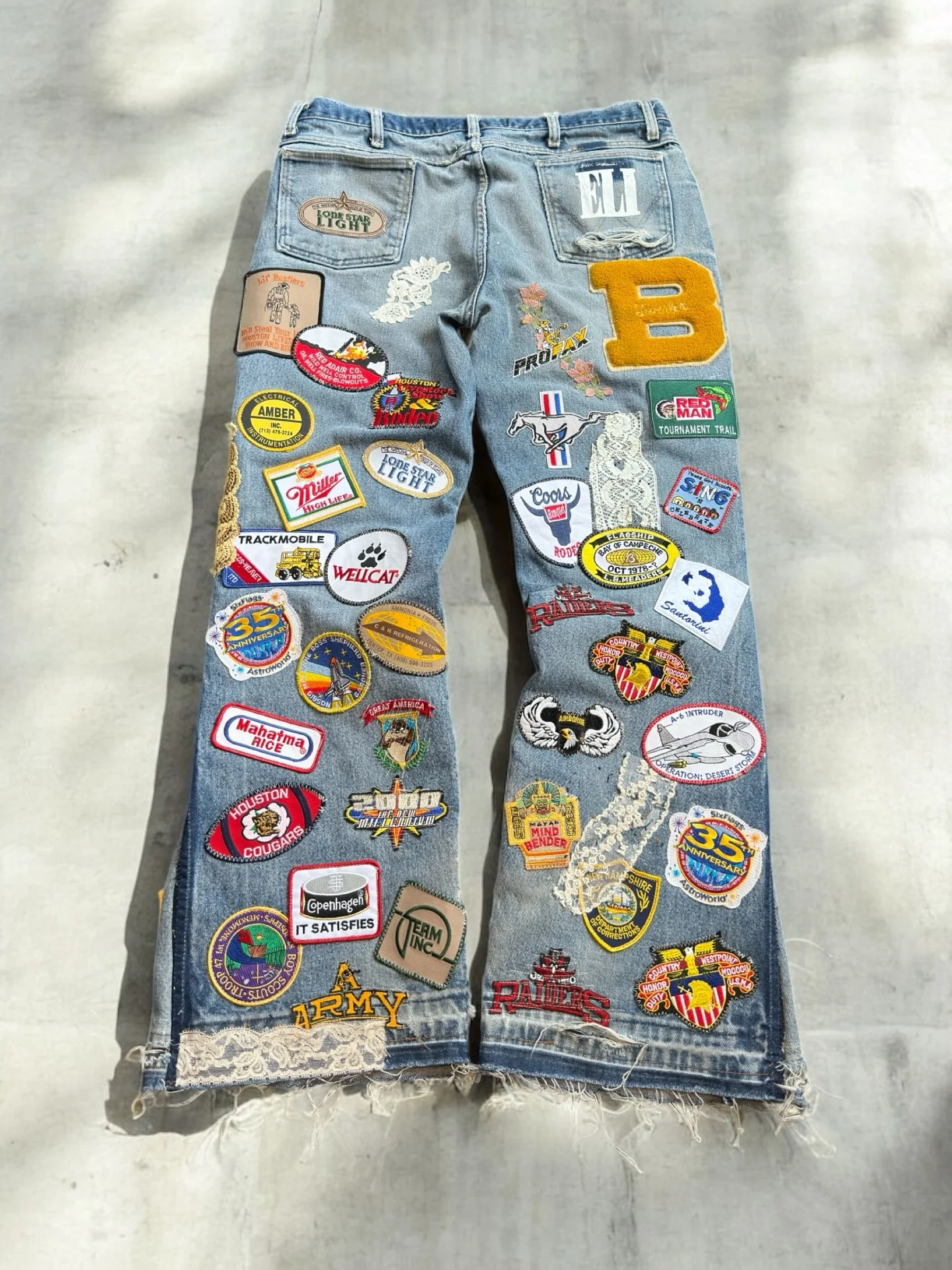 American Vintage Y2K Multi Patch Jeans Mens Womens Blue Distressed Bell Bottom Patch Embroidered Logo Pattern Baggy Trousers
