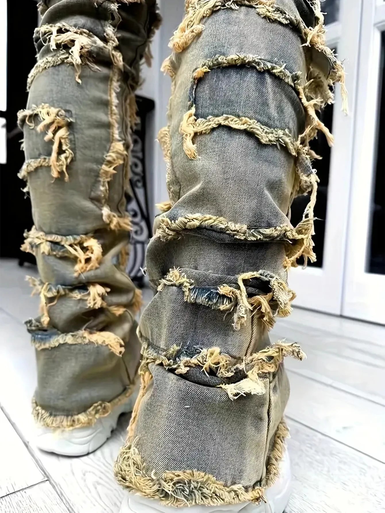 Distressed Men's Jeans Tassels Patchwork Design Vintage Washed Stretch Denim Pants Straight Fashion Streetwear Trousers