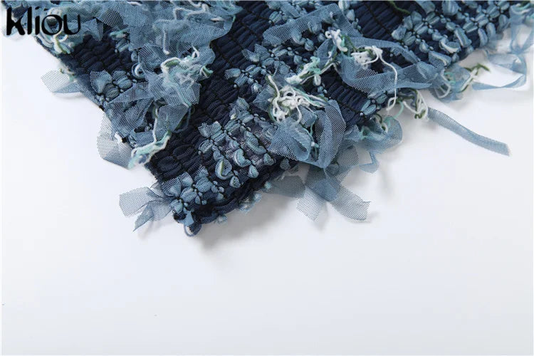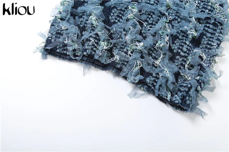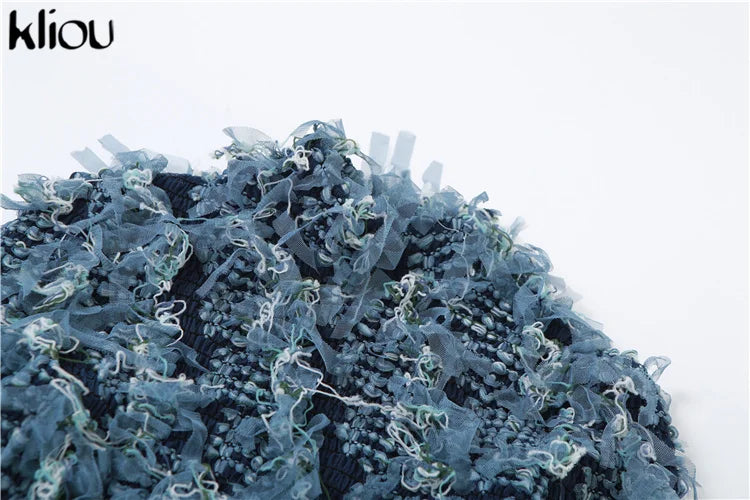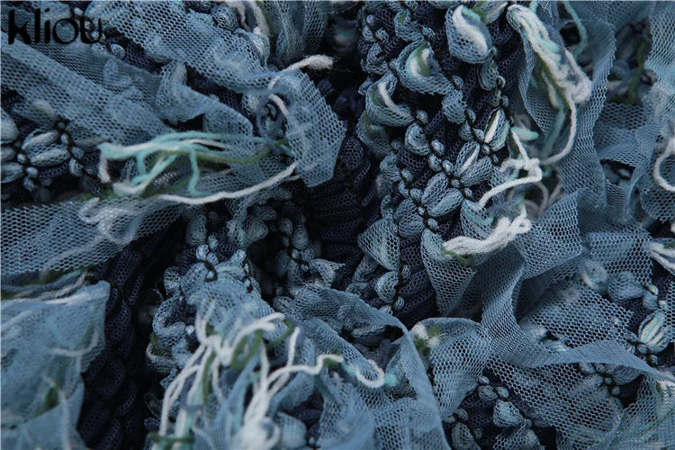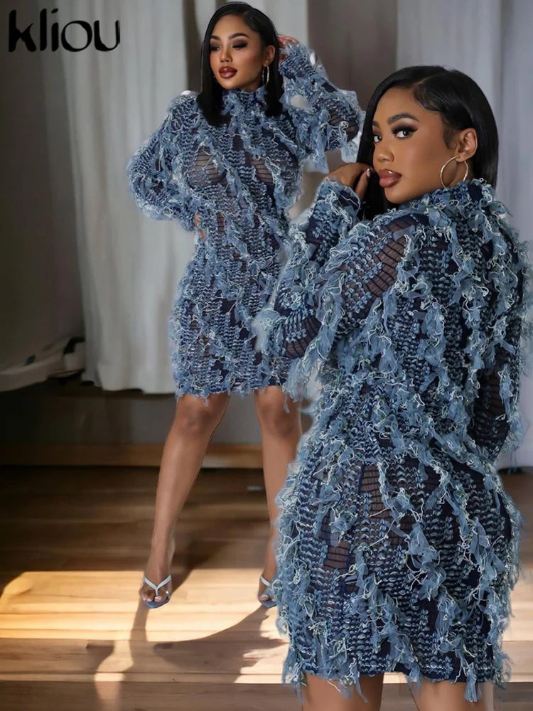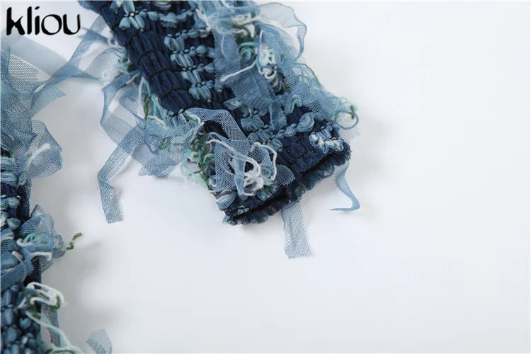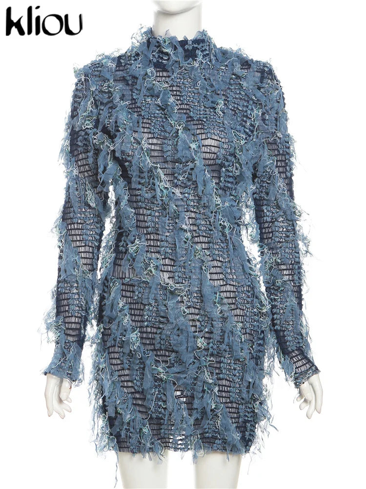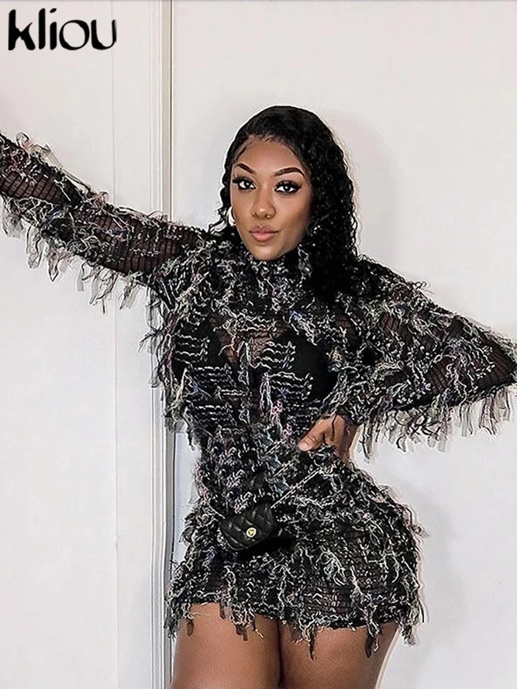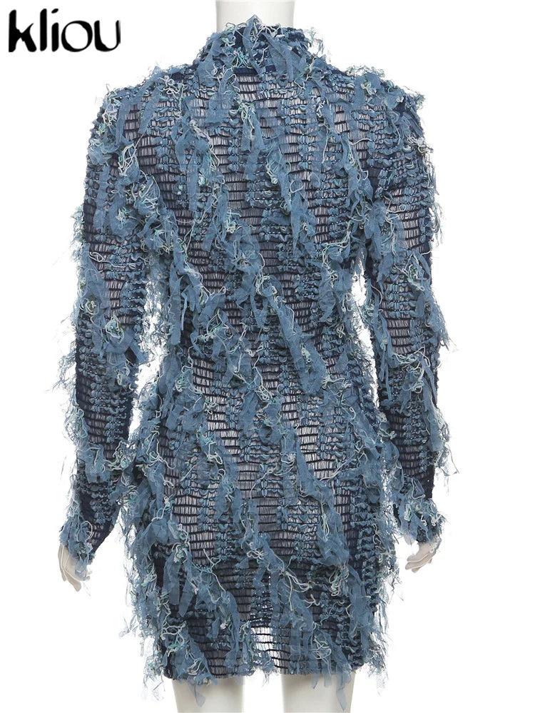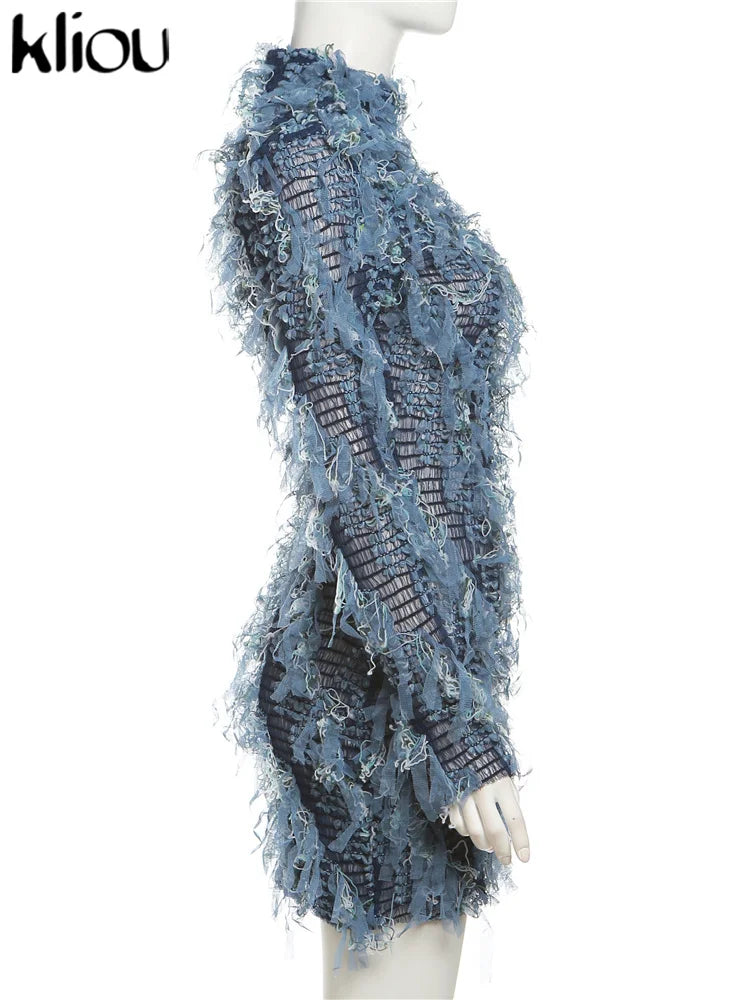kliou Ruched Patchwork Mini Dress Women Striped Stacked Autumn Full Sleeve Crew Neck Holes Chic Bodycon Female Trend Streetwear