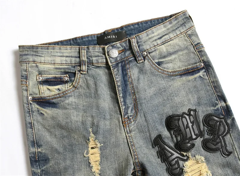 Mens Jeans with Embroidered Leather Patch Hole Punching Casual Black White Star Design by AMR